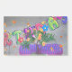 This artwork features a stylised "BIRTHDAY" banner strung across the top, with a prominent "A" positioned on the right side. Below, a small, potted plant adorned with colourful flowers is centrally placed. The background is a blurry interior scene, creating a festive atmosphere suitable for a birthday celebration. The image is framed by a solid purple border, providing a bold and defining edge.