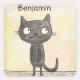 The sticker features a charming illustration of a black cat in a cartoon style. The cat is standing upright on its hind legs with a curious and slightly mischievous expression. Its large, round eyes are wide open, giving it an endearing and playful look. The background is painted in soft, pastel watercolor tones of yellow, beige, and light brown, creating a warm and inviting atmosphere. The overall style of the illustration is whimsical and light-hearted, with a hand-drawn, slightly textured appearance that adds to its charm.