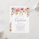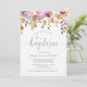 This lovely baptism invitation features pretty watercolor flowers in soft shades of pink, blue, purple, and white, with green and purple leaves. The word "baptism" appears in a pastel blue modern typography, along with a matching cross.