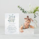 These beautiful Baptism invitations feature trendy watercolor style and elegant blue text. A rustic bohemian bouquet of soft dusty blue and white flowers and green eucalyptus botanical leaves decorates a cross, with matching subtle blue watercolor splashes on a white background. Add your favourite photo of your baby.