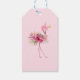 A cute exotic pink flamingo with crown and flowers on light pink background