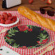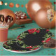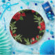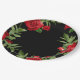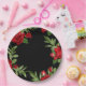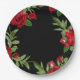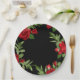 A floral ring of red flowers and greenery surround the centre of this wedding reception plate. The background is black.