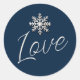 Elevate your holiday gifting and correspondence with a touch of sophistication using this captivating round sticker. The deep navy blue backdrop showcases a brushed silver snowflake at the top, evoking the enchantment of the season. Below, the word "Love" is elegantly scripted, embodying the spirit of affection and connection that defines this special time of year. Adorn your holiday cards, packages, and envelopes with this charming sticker to add a heartfelt sentiment and a dash of elegance. Whether you're sending warm wishes to loved ones or decorating your festive parcels, this sticker is a delightful way to express your feelings and share the joy of the holiday season.