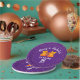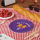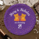 The background is purple with orange confetti-like dots.