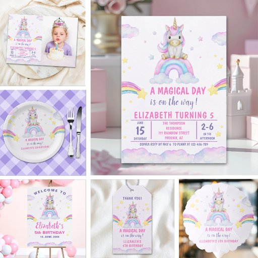 A cute and magical design for a girl's birthday! Celebrate your daughter's birthday with this adorable unicorn design featuring a rainbow and a multicolored background with gold accents. This design can be filled out with your daughter's birthday party details. Please see the collection for complementary products.