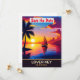 Lover Key save the date wedding invitation, travel postcard. Sailing boat on the water near the coast, palm tree, beautiful summer sunset in vibrant colours.
