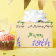 This loving birthday wrapping paper design features a message like "Happy 18th birthday, A-Name-Here!", where the name and birthday number can be personalised. The background is coloured beige. Wrapping paper like this might be used to wrap gifts being given to somebody who is celebrating a birthday. [~Z0000243]