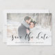 This elegant save the date card features your personal photo with a romantic black script overlay.