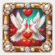 Two white doves symbolise love and peace within a golden frame adorned with pearls. Surrounded by vivid red hearts, the design evokes feelings of romance, affection, and elegance.