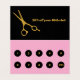 A simple, but eye-catching design of pink and black color blocks makes the perfect rewards card for anyone in the beauty industry. The inside has black on the top, with golden scissors and the stated reward; the scissors are a template object and can be replaced. The bottom is bright pink, with black dots and numbers, the last dot is marked with the reward. Very simple, modern, and stylish!