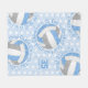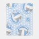 This cheerful volleyball themed fleece blanket features the image of a realistic volleyball that has light blue, grey and white panels, randomly spaced and patterned - the volleyball's blue and grey panels have an overlying doodle pattern of flowers, feathers and paislies - the text, "The volleyball court is my happy place" combined with cute hand-drawn heart shapes in blue encircles each volleyball in a casual typographic font - a tiny volleyball dots pattern overlies the customisable pale blue background - her name and jersey number are customisable - by katz_d_zynes