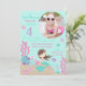 Little mermaid fourth birthday invitation card with underwater creatures and a photo insert template.