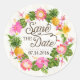Luau beach and tropical floral and rustic white wood background save the date label design.