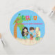 Start your celebration off right with this adorable Luau invitation. It's unique and round. Whether it's a backyard barbecue or a kids birthday party this is the perfect invite for you! It has bright, colourful letters spelling "Luau" in the top centre. There's a light blue sky background with a sandy beach. On the beach are 2 Hawaiian kids dancing. The girl has long black hair and is wearing a grass skirt and a lai around her neck. The boy is playing a musical instrument, guitar. There's a girl with long blonde hair dancing with flowers in her hair. Off to the left is a large palm tree. It's the perfect invitation for a boy, girl, or twins birthday party. Check out the many other designs and products in this line. ©pretty grafik