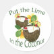 A graphic illustration of a coconut drink for a tropical party by artist/designer Charmaine Paulson on a sticker. The sticker has the text “Put the Lime in the Coconut”. ©2012charmainepaulson