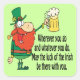 This St. Patrick's day sticker features a leprechaun holding a mug of beer and the saying "Wherever you go, and whatever you do, may the luck of the Irish be there with you."