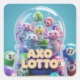 Playful, punny, and downright adorable! This cartoon-style illustration features a group of cheerful axolotls set against the backdrop of a colorful lotto machine, paired with the witty tagline “AXO LOTTO.”