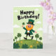 This greeting card shows a cheerful leprechaun in a cartoon style, standing on a rolling green hill with a friendly, welcoming stance that feels like he’s greeting someone close 💚. He wears an emerald coat and a tall hat with a buckle, paired with yellow-and-green striped socks and shiny black shoes. His bright orange beard frames rosy cheeks and wide eyes, and his open grin gives him the look of a pal leaning in for a laugh. In one hand he lifts a three-leaf clover ☘️, while the other arm stretches outward as if inviting a hug or a high-five. Above him, the words “Happy Birthday!” sit near the top in rounded black lettering that stands out against the pale green sky. The background fades from light to slightly deeper green with soft white clouds drifting behind the text. Along the bottom, small shamrocks and little yellow flowers dot the hillside in front of the leprechaun.