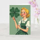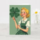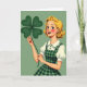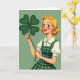 This design shows a smiling young woman in a retro cartoon style, with golden-blonde curls fanning around her face and bright blue eyes that glance warmly toward the viewer as if sharing a private joke with a close friend. Her rosy cheeks and red lips frame a grin that shows a sliver of white teeth, giving her expression a flirty, friendly spark. She lifts an oversized four-leaf clover in deep green, holding it gently in peach-toned hands, and the clover becomes the clear focal point ☘️. Behind her, the background stays a muted, even green, making her hair, face, and the clover stand out without distraction. She wears a white blouse with puffed sleeves and a Peter Pan collar trimmed with tiny dark-green polka dots, topped by a green-and-darker-green plaid pinafore that feels classic and cozy. The St. Patrick’s Day greeting sits in the open space beside the raised clover, set in dark green so it’s easy to read against the flat green backdrop 💚. Fine linework defines the curl strands, the collar edge, and the plaid pattern, while the large clover’s four rounded leaves spread wide near the upper right of the scene.