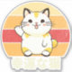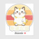Colourful illustration with "Lucky cat" text design in Japanese and a Kawaii cat raising one hand decoration on striped retro background