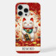 Make a statement with this iphone 15 pro max phone case that features a Lucky Cat with gold coins and flowers around it on a red and gold background. It's modern yet traditional Japanese Maneki-neko is designed to attract good fortune, prosperity and customers into your business. The right paw raised brings money and wealth and the white cat symbolizes general happiness. It becomes uniquely yours with your name in a CAP font in black. Invite luck and prosperity into your life!