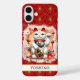 Make a statement with this iphone 16 plus phone case that features a Lucky Cat with red flowers around it on top of a gold and red background. It's modern yet traditional Japanese Maneki-neko is designed to attract good fortune, prosperity and customers into your business. The left paw raised brings customers and wealth and the white cat symbolizes general happiness. It becomes uniquely yours with your name in a CAP font in black. Invite luck and prosperity into your life!