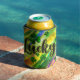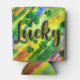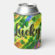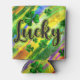 This vibrant can cooler features a colourful, streaked background with shades of green, yellow, orange, and blue. The word "Lucky" is prominently displayed in bold, black, glittery letters. Surrounding the text are multiple green shamrocks and sparkling yellow stars, adding a festive and cheerful touch. This design is perfect for celebrating St. Patrick's Day or bringing a bit of luck to any occasion.