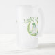 St. Patrick's Day Lucky Charm Leprechaun funny t-shirts, sweatshirts, hats, stickers and more. Leprechaun sitting on horseshoe holding beer. Show your Irish pride, Celtic humour.