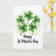 This card shows five four-leaf clovers gathered like close friends, their heart-shaped leaves touching in a loose cluster that feels quietly affectionate 💚. Each clover is painted in watercolor greens that shift from deep emerald near the center to a lighter, airy green along the rounded edges. Fine veins and soft texture make them look freshly picked, as if someone just leaned in to share a lucky find. Behind them, a gentle light-green wash ripples outward, creating a calm setting with a few darker green splatters for energy ☘️. The rest of the background stays bright white, giving the clovers plenty of space to stand out. Along the lower area, the words “Happy St. Patrick’s Day” appear in dark green, flowing lettering that anchors the open space beneath the cluster. The clovers sit slightly above the text, framed by the pale green wash and scattered speckles on the white page.