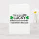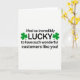 This card keeps things simple on a bright white background, where black sans-serif text sits centered like a neat note meant just for you. The message reads, “I feel so incredibly LUCKY to have such wonderful customers like you!” with the words arranged in a tidy stacked layout. “LUCKY” appears in large uppercase letters, drawing the eye the way a fond glance holds attention in a close friendship. Two emerald green three-leaf shamrocks sit on either side of “LUCKY,” like a small matching pair that frames the word with a gentle, affectionate touch 💚. Aside from those green accents, everything stays black and white, making the clovers feel like a quiet little gift of color ☘️. The spacing is open and uncluttered, giving the message room to breathe without any extra scenery or borders. The green shamrocks are positioned level with the center of the big “LUCKY,” one to the left and one to the right, with their stems angled slightly inward.