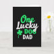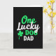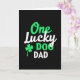 This greeting card features a deep black background with the phrase “One Lucky Dog Dad” stacked in the center, creating a strong focal point. “One” and “Dog” appear in white, set in a sturdy, rounded sans‑serif style that feels friendly and easy to read. “Lucky” sits between them in emerald green cursive lettering, adding a softer, more affectionate touch, like a warm glance shared between best pals. “Dad” anchors the bottom in white with thicker, squared lettering, giving the layout a confident finish without crowding the design. A green shamrock ☘️ is tucked near the wording as a small accent, reinforcing the St. Patrick’s Day theme and adding a little spark of charm. The limited palette of emerald green and white pops sharply against the black, making the message clear from across the room 💚. The overall composition stays centered and balanced, with the shamrock punctuating the text like a neat little leaf beside the letters.