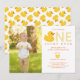 Celebrate a sweet milestone with this charming Lucky Duck first birthday photo invitation, featuring an adorable duck illustration and playful “One Lucky Duck” design. This modern layout pairs a personalized photo with warm yellow and soft orange tones, creating a joyful and memorable invitation for your little one’s special day.