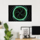 Bright streaking threads of light flow and curve around and into a circular shape, all glowing brilliant green, in this original fractal design! Great gift idea!