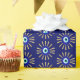 Colourful blue gift wrap printed with the Evil Eye lucky symbol and gold sunbursts. Striking lucky talisman blue wrapping paper.