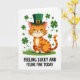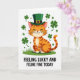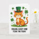 This card shows a friendly ginger cat in warm orange tones, with soft stripes and a tiny pink nose, sitting on a bright green patch of grass 💚. The cat wears an emerald leprechaun hat with a shiny gold buckle, tilted just enough to feel like it’s dressed up for someone special. Its eyes are closed in a calm, pleased smile, and the whiskers fan outward as if it’s soaking in a sweet moment. Around the cat, four-leaf clovers float in different sizes, adding little sparks of green that make the scene feel like a shared celebration ☘️. The background stays white and open, keeping the focus on the cat and the clovers circling it. Centered below the illustration, the phrase “FEELING LUCKY AND FELINE FINE TODAY” appears in black, all-cap letters, set on a single line that anchors the picture. The hat’s deep green contrasts with the cat’s orange fur, while the scattered clovers frame the character like a loose, leafy halo.
