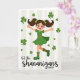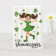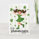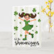 This card shows a joyful cartoon girl mid-dance, arms stretched wide and one leg lifted as if she’s twirling toward a friend with an inviting grin 💚. She wears an emerald-green dress with a slim orange belt, and matching green boots marked with orange stripes that echo the festive color pairing. Her dark pigtails are tied with tiny shamrock clips, and her rosy cheeks and wide smile give her a sweet, affectionate glow. Shamrocks of different sizes float around her like confetti, adding a flirty, lucky sparkle to the moment ☘️. The background is set with soft vertical stripes in off-white and pale green, keeping the scene light while still feeling lively. Centered near the bottom, the phrase “let the shenanigans BEGIN” appears in a flowing style, with “BEGIN” standing out in uppercase for extra emphasis. The lettering sits just below her boots, leaving plenty of open space around the dancing figure and drifting shamrocks. Behind her, the pale stripes alternate evenly from top to bottom, framing the green-and-orange outfit against a gentle, festive backdrop.