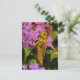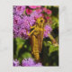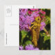 The grasshopper is a symbol of good luck all over the world. This fine art photography postcard features a yellow and brown grasshopper climbing up a fluffy pink, red and magenta ageratum floss flower. He is looking over his shoulder at the photographer with his huge gold and black eye. Lovely green foliage frames the photograph. Perhaps this postcard will be a lucky charm!