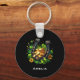 Keychain with a St. Patrick's Day themed image. A black and gold horseshoe sitting in a bed of green clover with shiny gold coins.