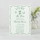 This design features soft vertical green stripes, graceful scalloped borders, and iconic lucky motifs including a four-leaf clover, horseshoe, and martini glass—symbolizing good fortune, love, and celebration. The elegant script and serif typography combination creates a polished look that’s ideal for garden bridal showers, spring brunches, country club events, outdoor luncheons, or Irish-inspired celebrations.