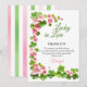 Lucky in Love St. Patrick's Day bridal shower Thank You Card wth a modern colour twist. A charming border of green and pink clovers is artfully arranged along the left side, bottom, and upper edges, creating a festive and elegant frame for your message of appreciation. To further enhance the celebratory mood, the back of the card features a cheerful pattern of green, pink, and white watercolor stripes, adding a touch of whimsy and joy.