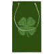 Lots of tiny clovers decorate this large four-leaf clover or shamrock leaf that is sitting on a dark green background.