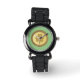 This awesome watch features a graphic image of a gold coin with two shades of gold. The outer circle has a rough texture. Inside the inner circle of the coin is a textured golden shamrock made up of 3 leaves and a stem.