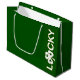 Large dark green glossy gift bag with “Lucky” printed vertically on the front in white letters with a white clover for the letter u. See the entire St. Patrick's Day Gift Bag collection in the PARTY FAVORS section.