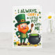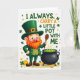 This St. Patrick's Day card features a cheerful cartoon leprechaun centered on a white background, dressed in an emerald top hat with a gold buckle, a matching green jacket and trousers, and a lighter green vest with gold buttons. His bright orange beard and rosy cheeks frame a wide smile that feels like he’s sharing an inside joke with a close friend 💚. In one hand he holds a wooden spoon, angled toward a sturdy black cauldron as if he’s inviting you to step closer and peek in. The cauldron bubbles with glowing green brew, with curling steam rising above it, and gold coins and four-leaf clovers scattered around his boots ☘️. Above the illustration, the line “I ALWAYS CARRY A LITTLE POT WITH ME” is set in all caps, split between green and warm orange lettering. Small golden stars are sprinkled around the figure and the text, adding extra sparkle against the open white space. The leprechaun’s hat tilts slightly forward, and the cauldron’s rim catches a soft highlight beside the nearest pile of coins.