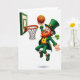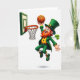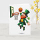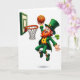This card features a leprechaun caught mid-dunk, floating high against a bright white background with a tiny shadow under his shoes. He wears an emerald green suit and a tall green top hat topped with a gold buckle, and his orange-red beard frames a wide grin that feels like he’s showing off for a close friend watching courtside 💚. With his left arm stretched toward the hoop, he holds an orange basketball just above the rim, turning the moment into a friendly, flirty little show of confidence. A small four-leaf clover appears to sprout from his back, adding a lucky touch ☘️. The lighting is even and bright, bringing out the suit’s texture and the pebbled look of the ball. The greeting text sits near the top in green lettering, while a shorter line in gold is placed beneath it, leaving plenty of open space around the action. The hoop and net sit to the right of the leprechaun, with the orange rim and white net standing out sharply against the white backdrop.