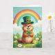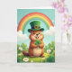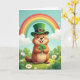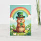This design shows a cheerful, groundhog-like character centered in the scene, smiling wide with rosy cheeks and bright, sparkling eyes as it lifts a four-leaf clover ☘️. It wears an emerald-green leprechaun hat with a gold buckle, tilted just enough to feel like a friendly wink. Behind it, a soft cerulean sky stretches out, and a rainbow 🌈 arcs across the background above drifting, fluffy clouds. Tiny white specks dot the air like light confetti, adding a gentle, close-to-you atmosphere around the character. Along the bottom, a thick carpet of green clover leaves spreads across the foreground, dotted with small white daisies with warm yellow centers. The greeting “Happy St. Patrick’s Day” sits near the top in bright white letters, easy to spot against the blue sky. The rainbow bands glow softly above the character while the daisies and clover cluster tightly along the lower edge.