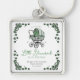 This white "Lucky Little Shamrock" gender neutral baby shower key chain features a chic hand-drawn Irish Victorian baby carriage adorned in soft green tones and surrounded by green lucky shamrocks, all against a white background. Ideal for St. Patrick's Day baby shower gift!