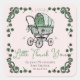 These soft pink "Lucky Little Thank You" gender neutral baby shower favour stickers feature a chic hand-drawn Irish Victorian baby carriage adorned in soft green tones and surrounded by green lucky shamrocks, all against an elegant blush pink background. These stickers are from the "Lucky Little Shamrock" baby shower collection.