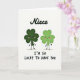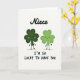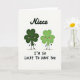 On the front of the card two smiling shamrocks stand close together on a bright white background, their tiny stick arms angled as if they’re about to link hands in a sweet, friendly way 💚. The left shamrock is a deeper forest green, while the right one is a lighter lime green, and both have small black dot eyes, curved smiles, and rosy pink cheeks that make them look bashful around each other. Their thin legs end in little feet, with faint shadows beneath them that gently anchor them in place. Centered above their heads, the word “Niece” appears in dark lettering with smooth, flowing strokes. Centered below the characters, “I’M SO LUCKY TO HAVE YOU” is written in all caps in a thick, friendly black font that’s easy to read. The simple layout leaves plenty of open space, keeping the focus on the pair and their affectionate closeness ☘️. The two greens contrast softly, and the blush on their cheeks adds a warm touch against the white backdrop. A subtle gray shadow sits under each shamrock’s feet, just below the midline of the card.