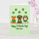 The front design shows three stylized dogs standing close together in a neat row on a soft green background, their matching bright green glasses giving them a sweet, friendly togetherness 💚. An orange pup wears a green sweater dotted with shamrocks, leaning slightly toward the others as if posing for a photo. Beside it, a chocolate-brown dog sports a green bandana, its relaxed stance and gentle expression suggesting an easy bond with the group. On the other side, a brown-and-white beagle-type dog wears a striped green jumper, angled in a way that makes the trio feel like close pals sharing the moment ☘️. Five dark green shamrocks float across the upper area, spaced evenly like simple decorations hanging overhead. Near the bottom, dark green lettering reads “Happy St Patrick’s Day! Little Sister,” centered and set low against the green field. Small yellow shamrock accents sit around the dogs and clothing details, adding warm contrast to the greens.